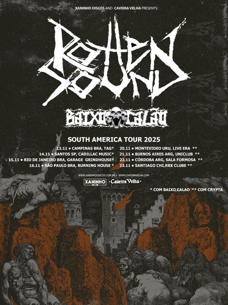 Na capital paulista, o Rotten Sound é a atração principal do Bréa Extreme 2025, em um domingo, junto às bandas nacionais Baixo Calão, Desalmado, D.E.R., Plague Rages, VØid It e Rabujos. Saiba mais sobre o evento clicando aqui.